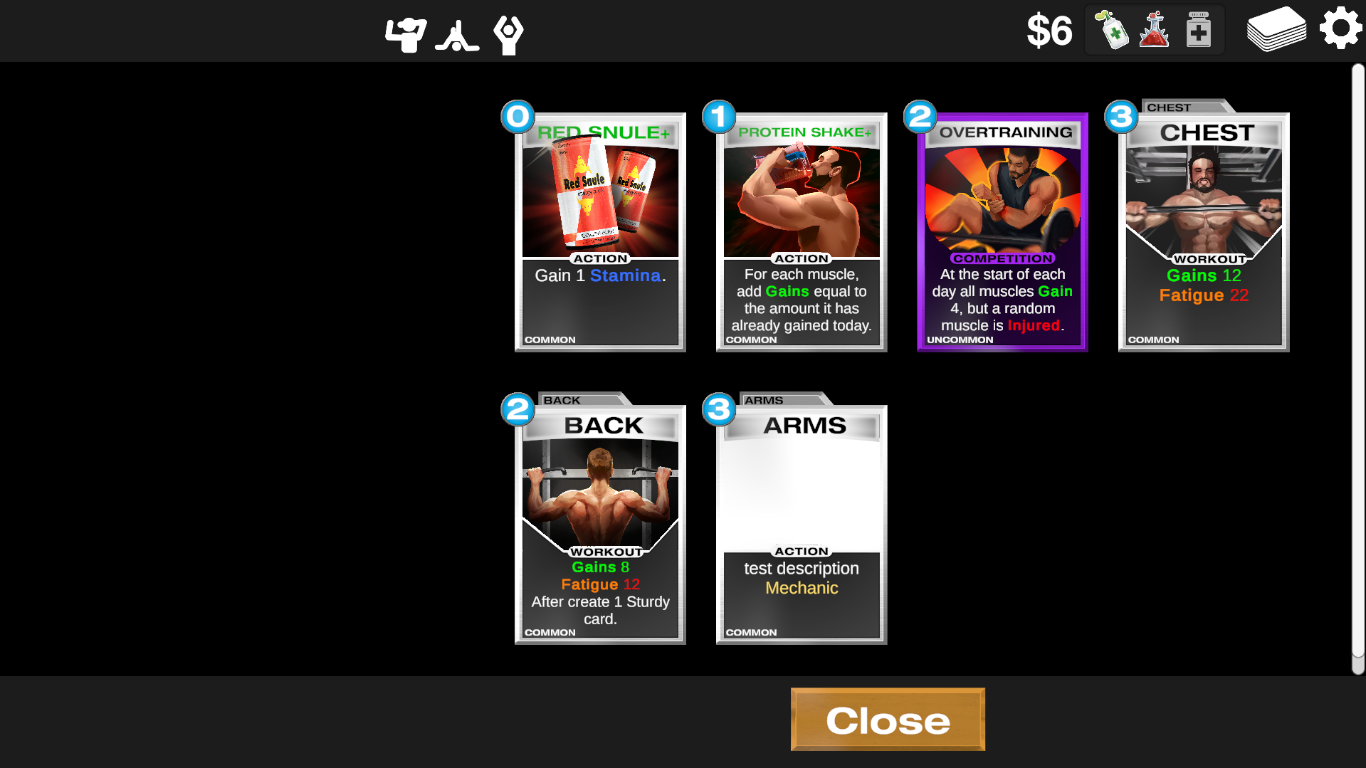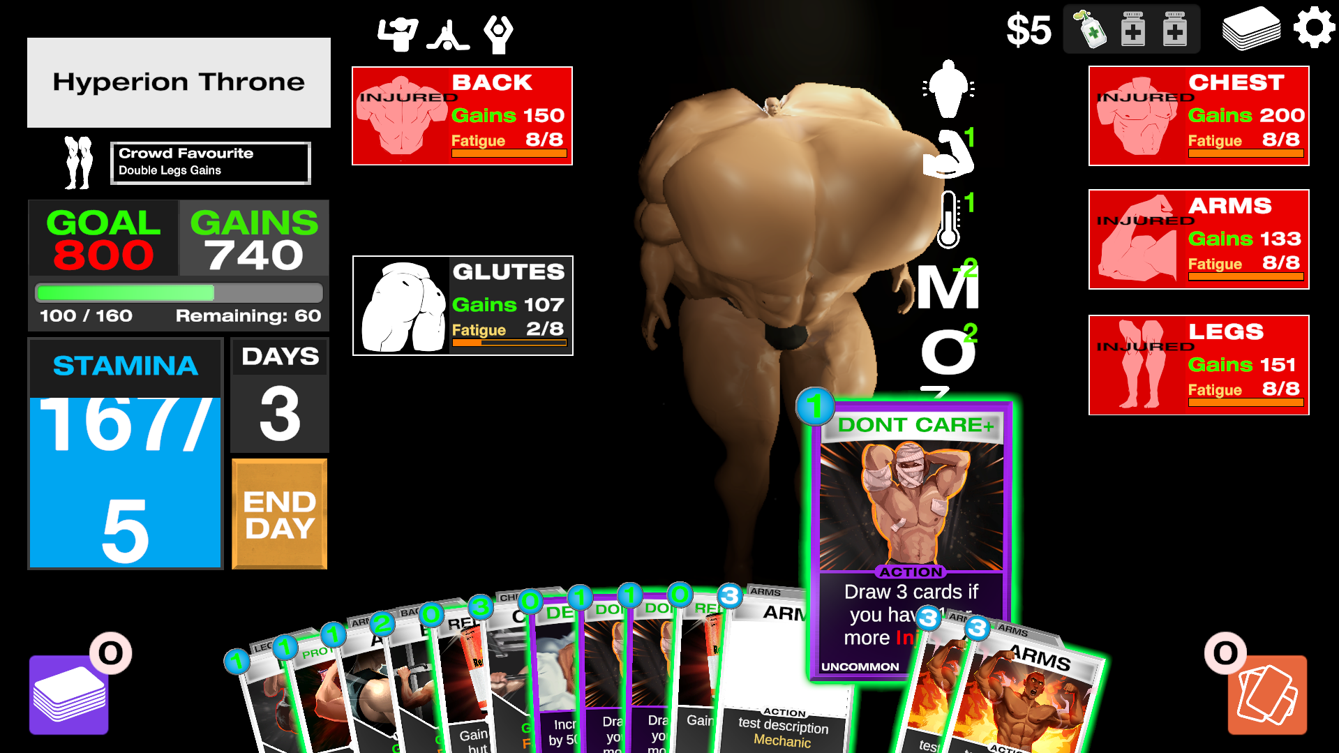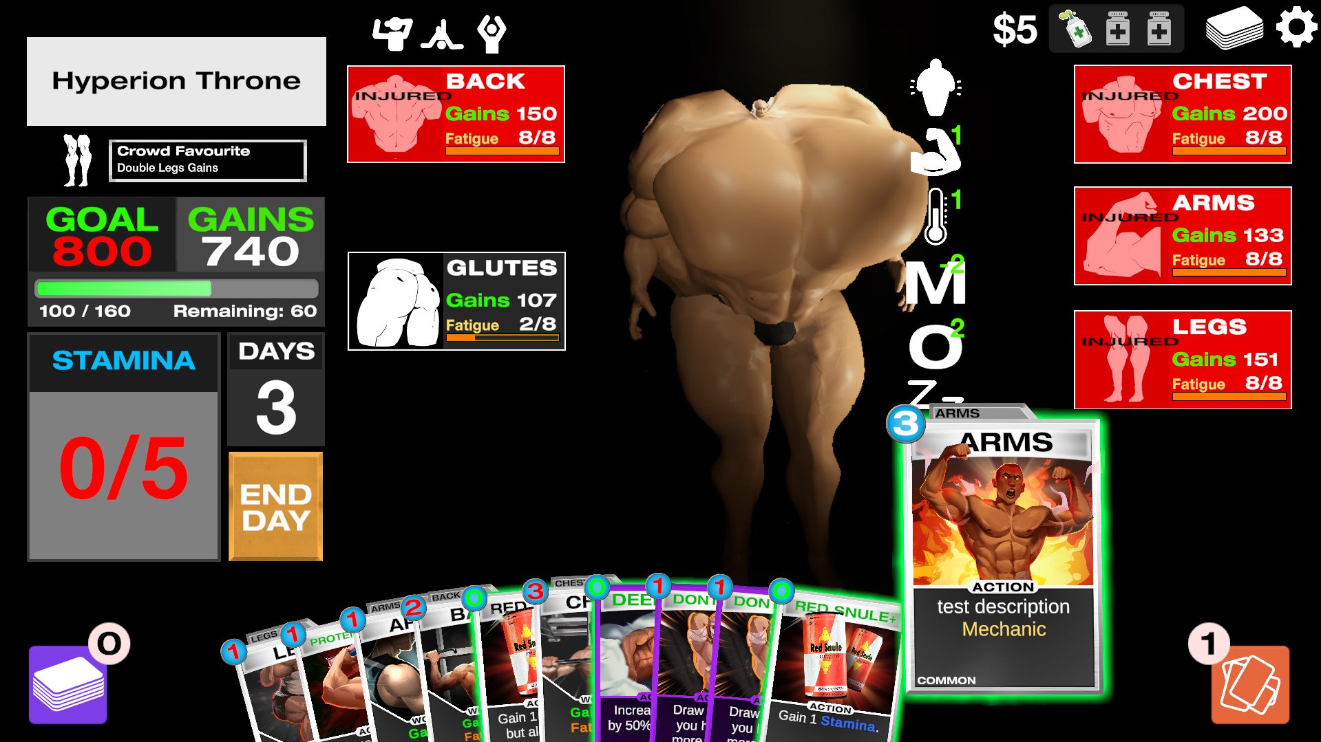 - Play rest and supplement cards to increase your Gains or decrease muscle Fatigue.