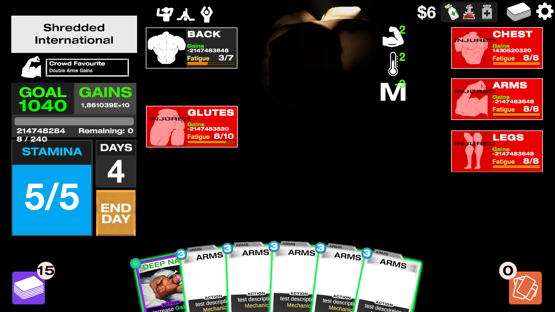 Then I found that none of the cards disappear from my hand, and started spamming PROTEIN SHAKE+. And then I ended the competition.